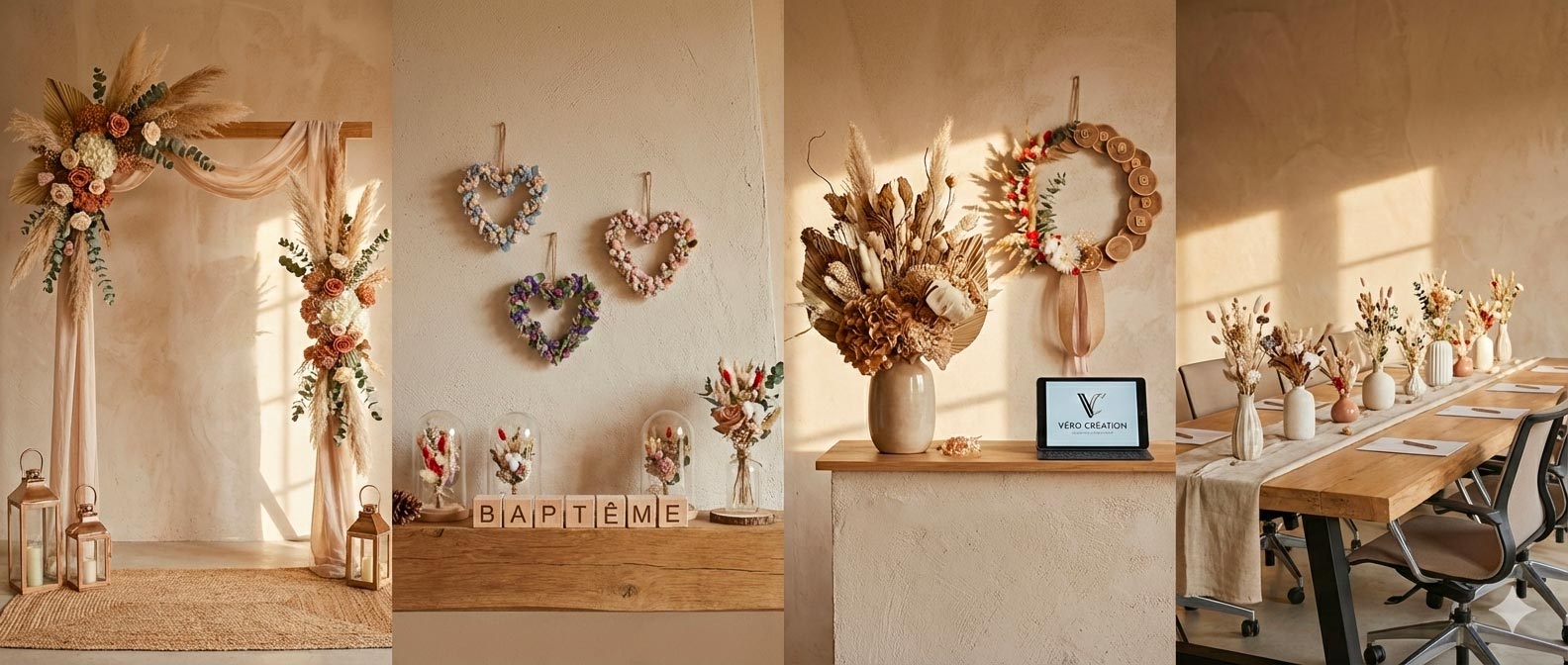 Niché à Yvoire au bord du Léman, Véro Création est né d'une passion pour l'art floral. Je confectionne à la main des compositions en fleurs séchées durables et poétiques, pensées pour embellir votre intérieur saison après saison.